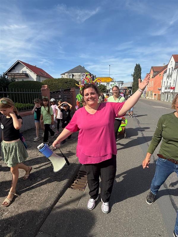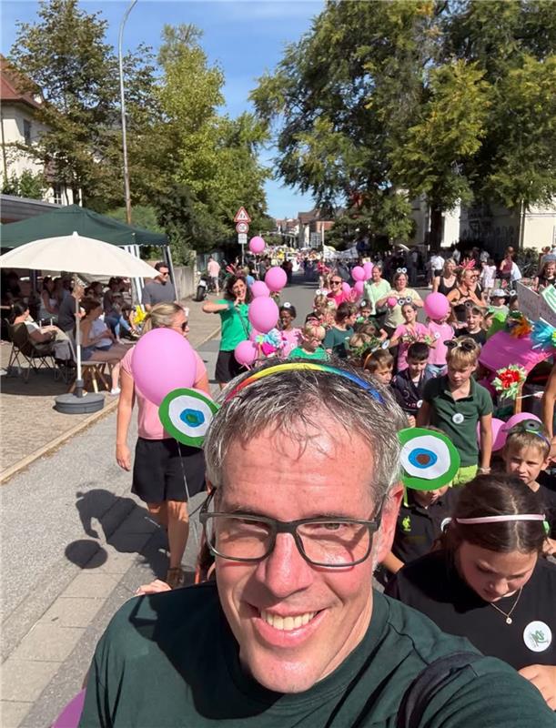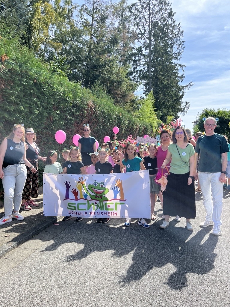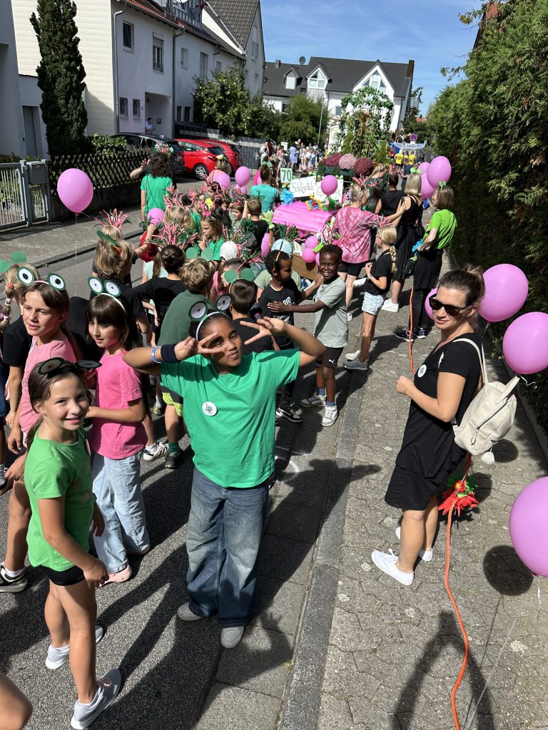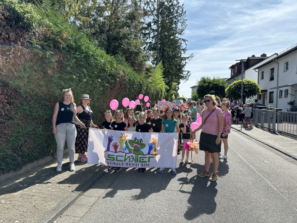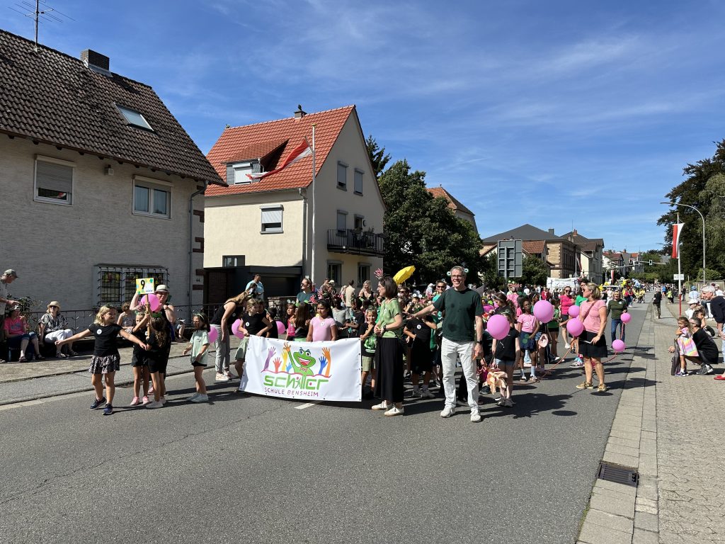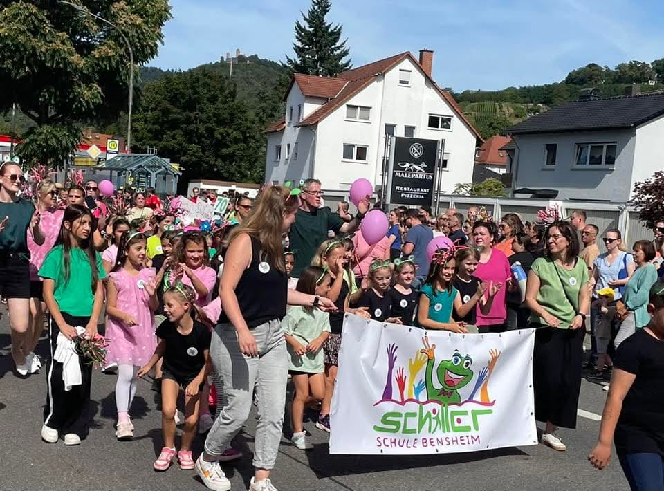 Bensheim. Mit großer Freude und spürbarem Stolz war die Schillerschule Bensheim heute beim traditionellen Winzerfestumzug vertreten. Zahlreiche Grundschülerinnen und Grundschüler liefen gemeinsam durch die belebten Straßen und zeigten eindrucksvoll, wie lebendig und fröhlich unsere Schulgemeinschaft ist. Auch unser Schultier, der grüne Frosch Fridolin, durfte selbstverständlich nicht fehlen und begeisterte die Zuschauer am Straßenrand.